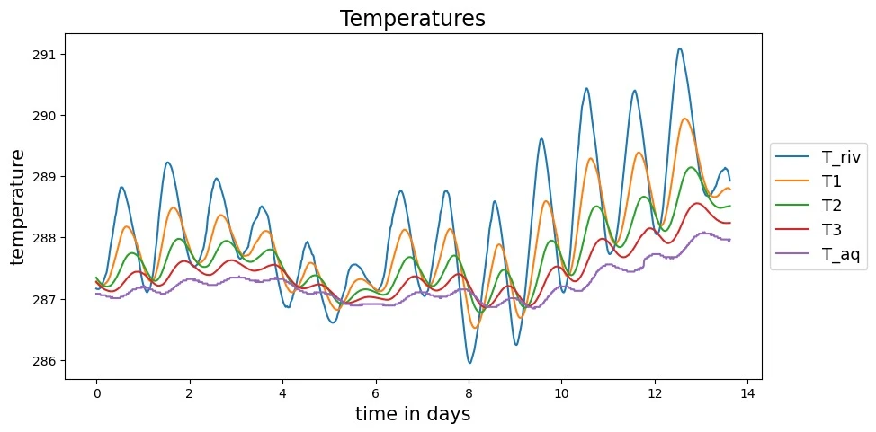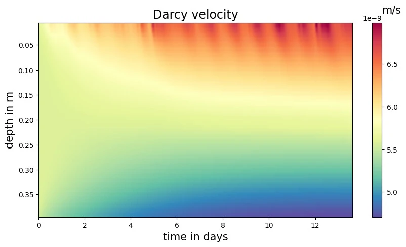 In this example, with real terrain data, we see that the Darcy velocity is positive. Because we oriented positive \(z\) towards the ground, this means that the river water is infiltrating the aquifer.